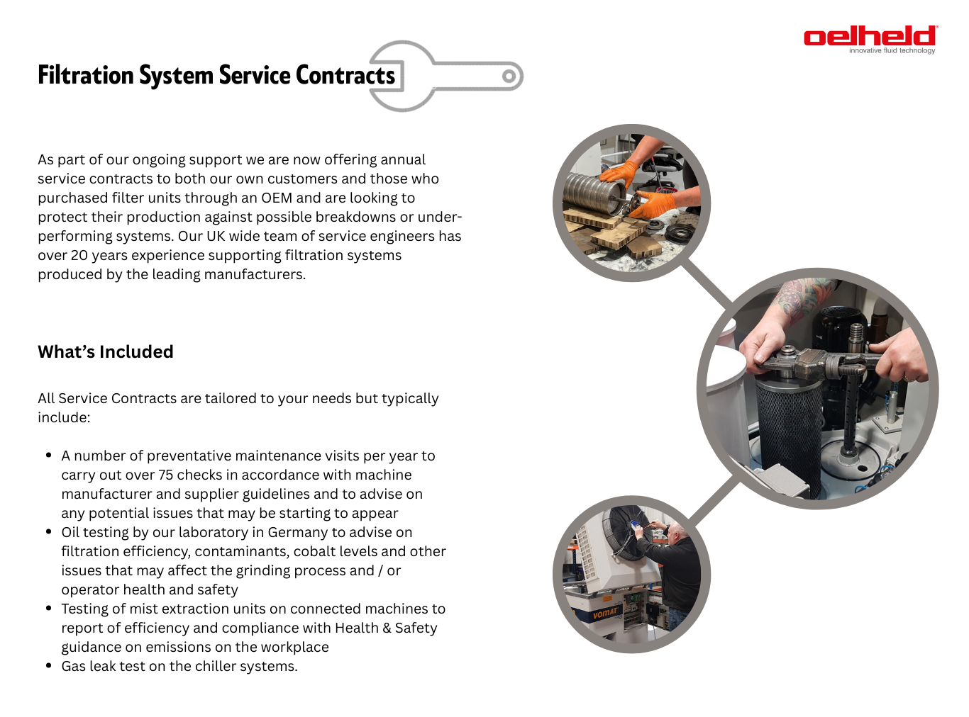 Our UK wide team of service engineers has over 20 years experience supporting filtration systems produced by the leading manufacturers. Their oelSmart training means there is no fluid, filtration or mist extraction related issue they cannot tackle and they take a proactive whole-system approach to ensure consistent performance, productivity and operator safety. From specification and installation of units, pipework, chillers and ducting, to ongoing preventative maintenance, and testing of oil, air and LEV systems, our skilled engineers are considered a part of the team at many customer sites and are experts in: